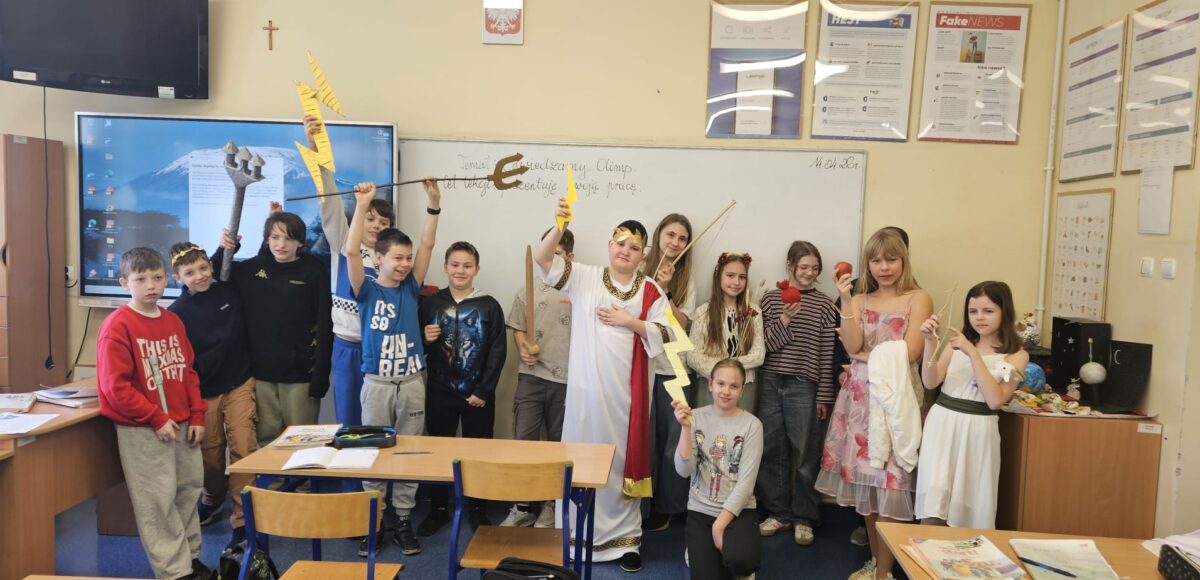 Uczniowie klasy 5a przygotowali stroje i atrybuty bogów greckich. Prezentowali swoje prace na forum klasy w czasie lekcji języka polskiego. Lekcja była bardzo ciekawa, a prezentowane informacje okazały się wspaniałą formą powtórzenia poznanych wiadomości z mitologii. Gratuluję uczniom pomysłowości.