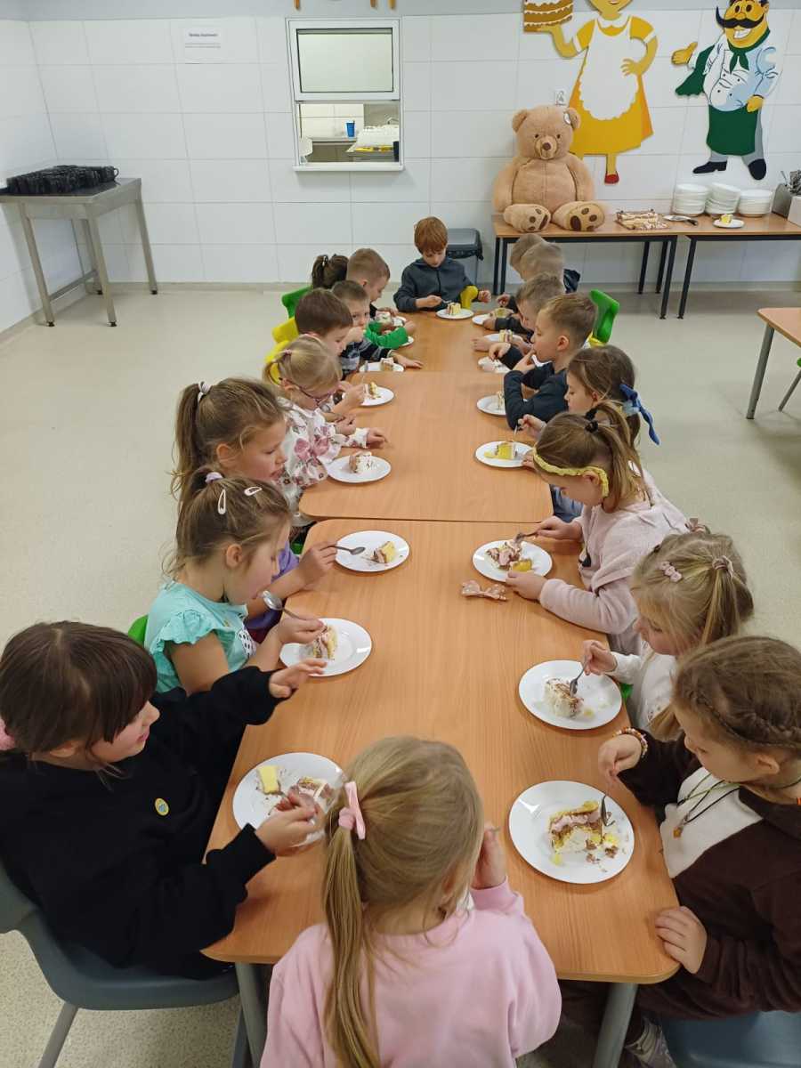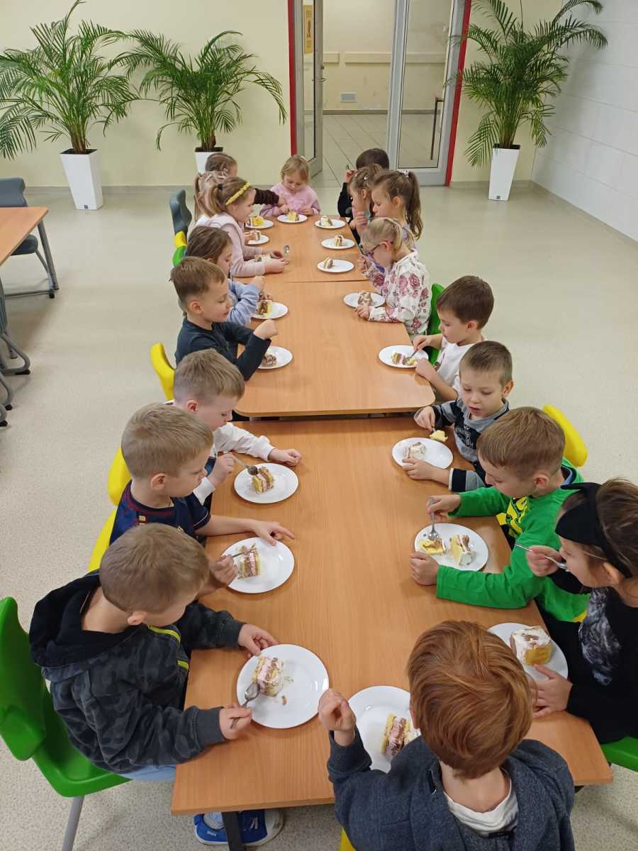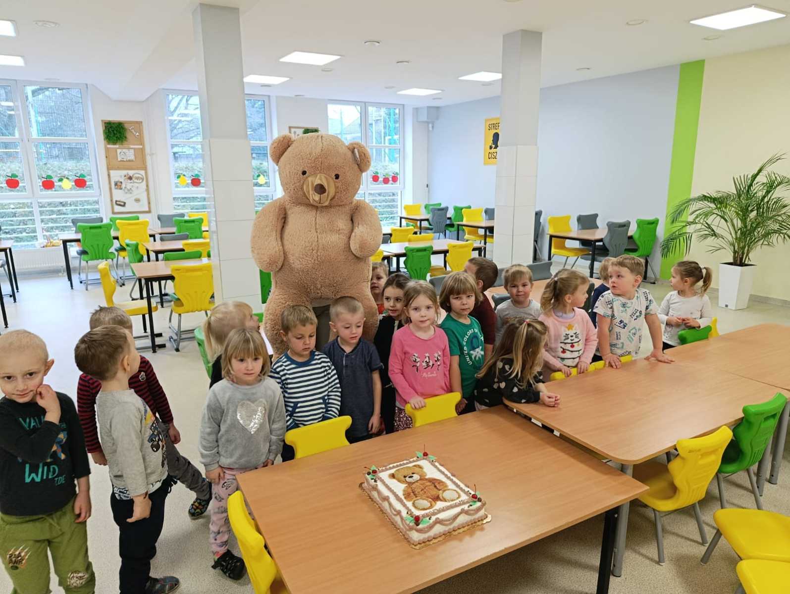 Po zakończonych zajęciach na każde dziecko czekała miła niespodzianka – balon z ilustracją misia oraz specjalna naklejka. Dodatkową niespodzianką i atrakcją był przepyszny tort, przygotowany specjalnie na tę okazję.