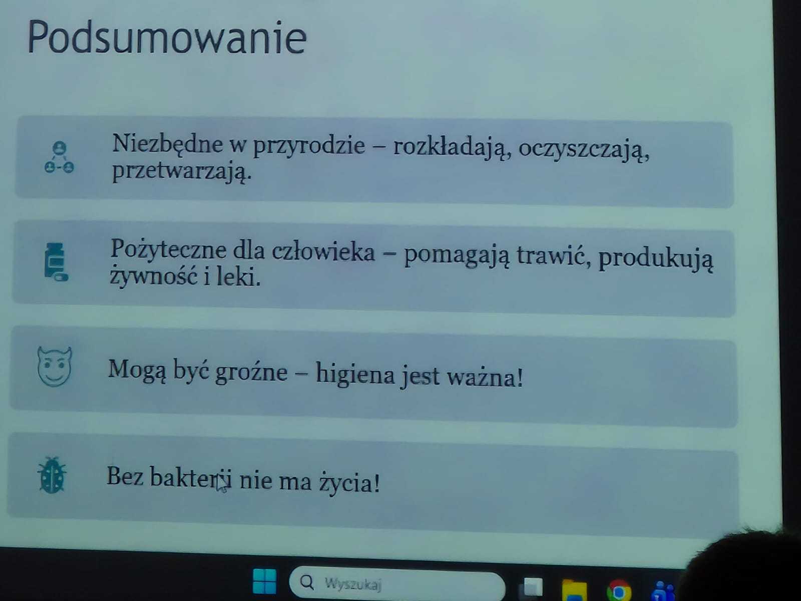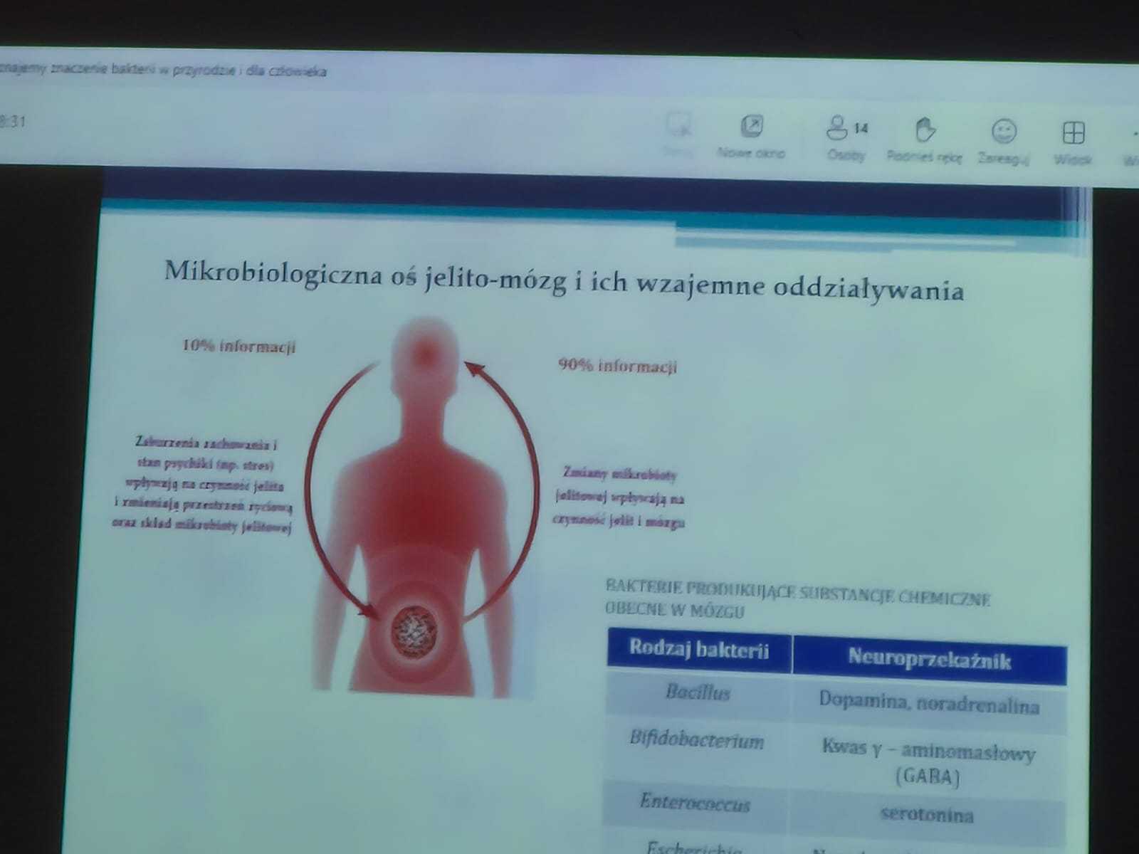 26.11.2025r. Uczniowie naszej szkoły uczestniczyli w lekcji on- line z biologii.Temat: Znaczenie bakterii w przyrodzie i życiu człowieka.Wykład poprowadziła dr inż. Alicja Dłubała z Katedry mikrobiologii Zachodmiopomorskiego Uniwersytetu Technologicznego w Szczecinie. Lekcja pozwoliła w nowoczesnej formie zrealizować temat z podstawy programowej kształcenia ogólnego.Po wysłuchaniu informacji uczniowie mieli okazję odpowiadać on-line na pytania związane z lekcją.Spotkało się to z dużą aktywnością i entuzjazmem dzieci.Dziękuję Pani metodyk Małgorzacie Majewskiej reprezentującej Szczeciński odział Polskiego Towarzystwa Przyrodników im.M. Kopernika za zaproszenie.Mając nadzieję na kolejne spotkanie do zobaczenia.