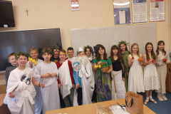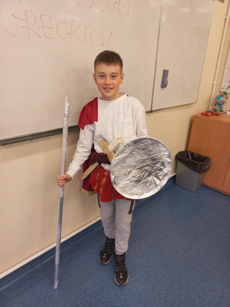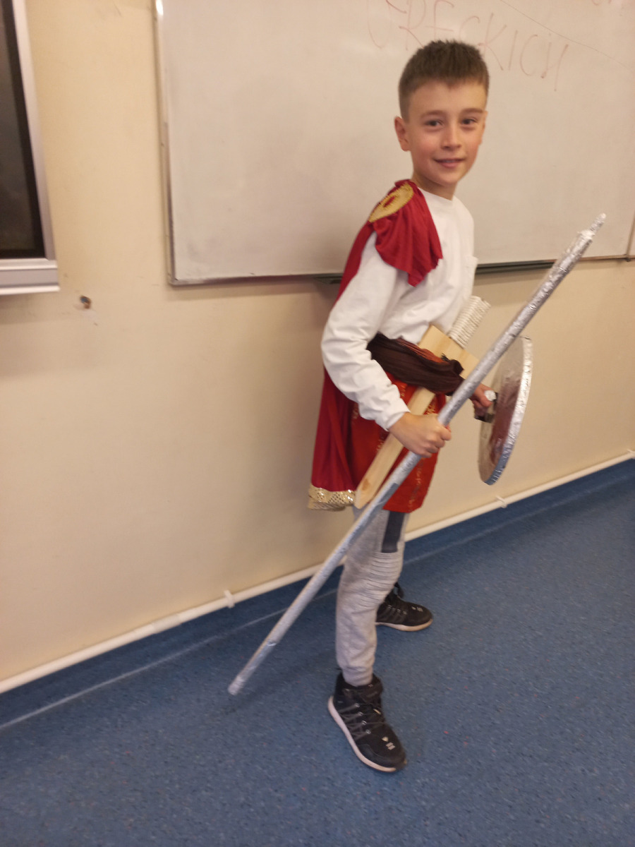Uczniowie klasy 5b podczas lekcji języka polskiego z panią Darią Durzyńską – po omówieniu mitologii greckiej – wcielili się w potężnych, nieśmiertelnych i nadludzko silnych bogów oraz herosów. Mogliśmy podziwiać: Gromowładnego Zeusa, zazdrosną Herę, Demeter z córką Korą, Hadesa, Aresa, Heraklesa, Achillesa, Afrodytę, Atenę, Posejdona, Hefajstosa czy Apolla.