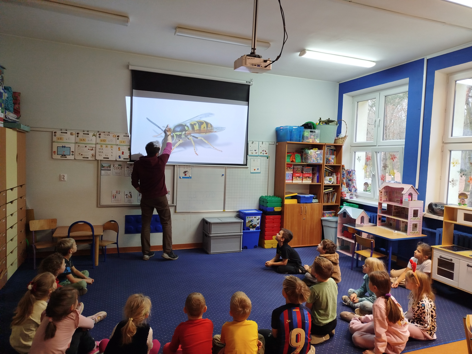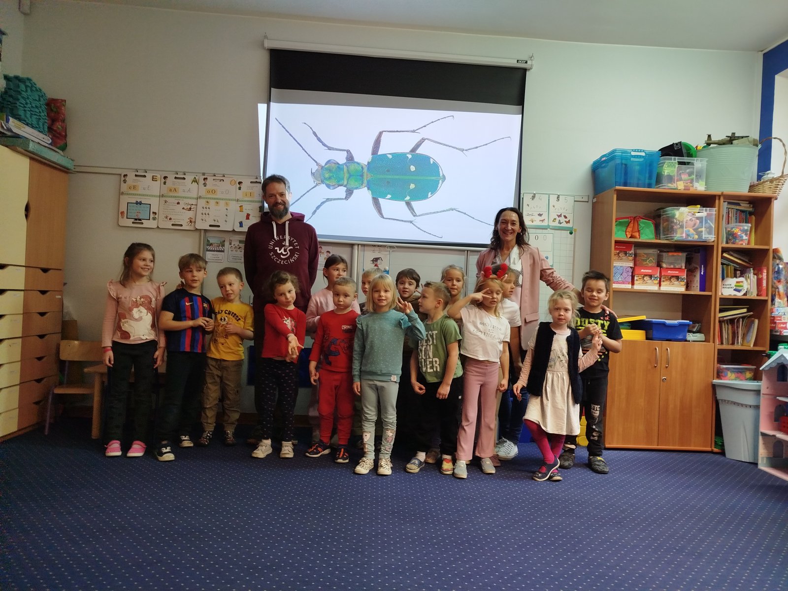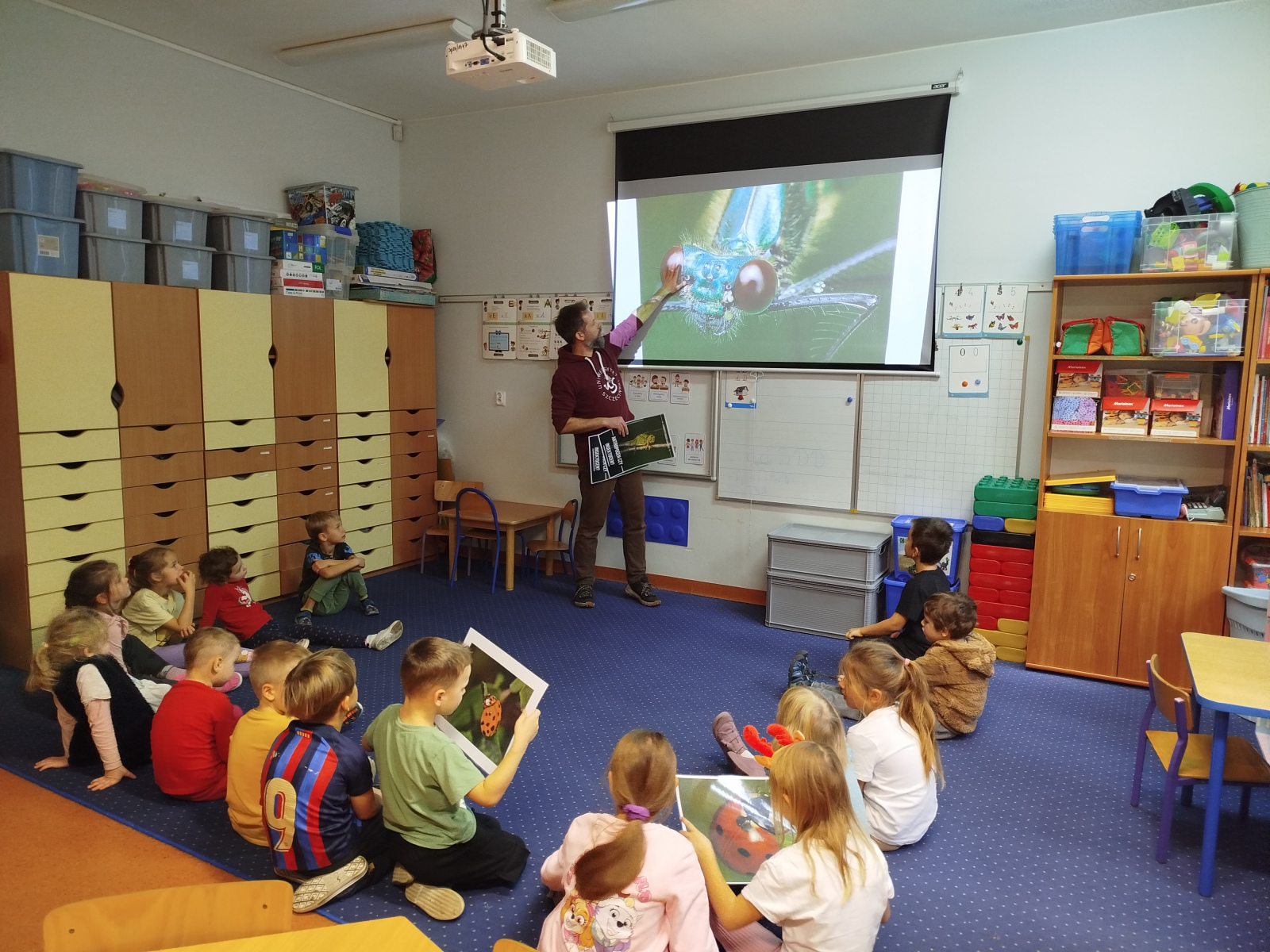 Podczas spotkania przedszkolaki dowiedziały się, że owady – podobnie jak ludzie – mają zmysły, dzięki którym orientują się w otoczeniu. Gość opowiadał o różnych gatunkach, m.in. o pchle, klecance, trzyszczu, pływaku, chrząszczu, szerszeniu czy straszyku. Dzieci z zainteresowaniem słuchały ciekawostek o życiu tych małych stworzeń.