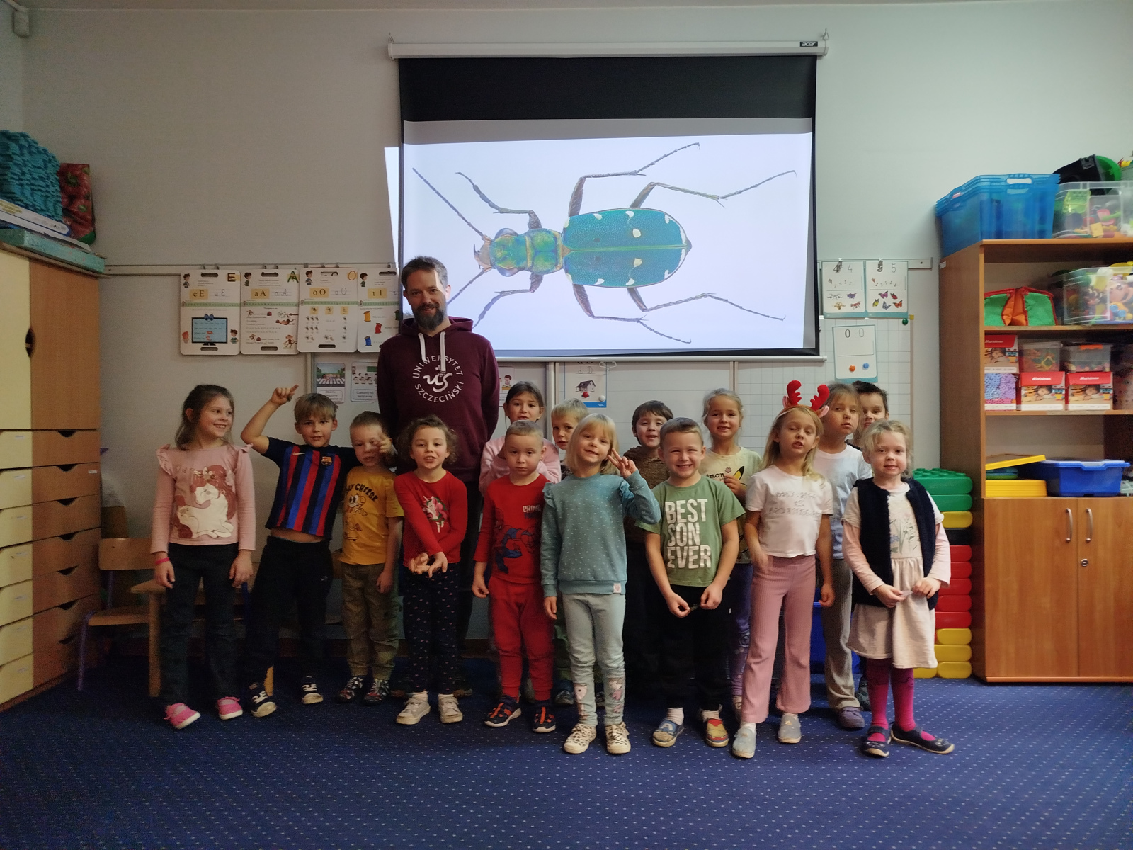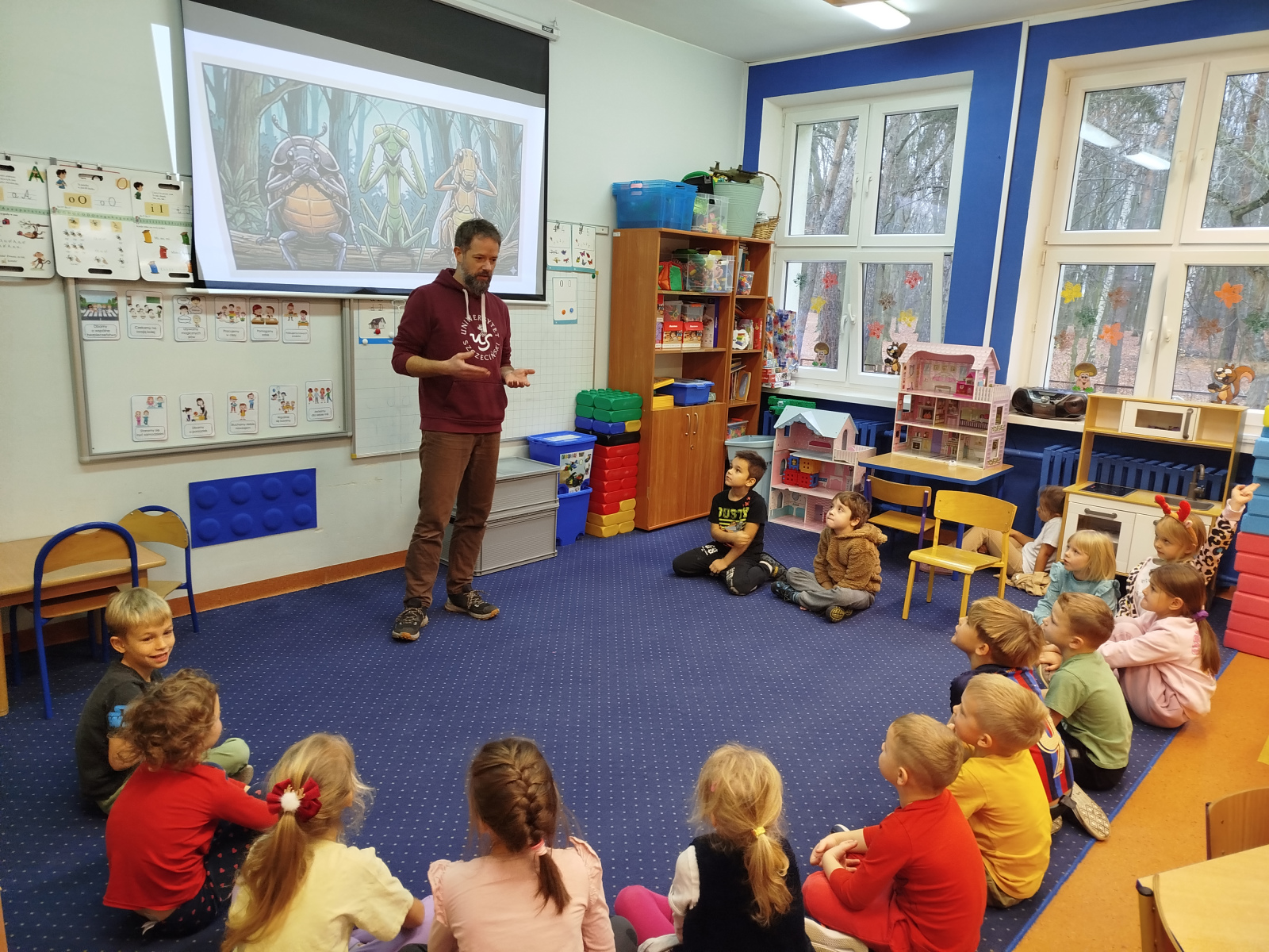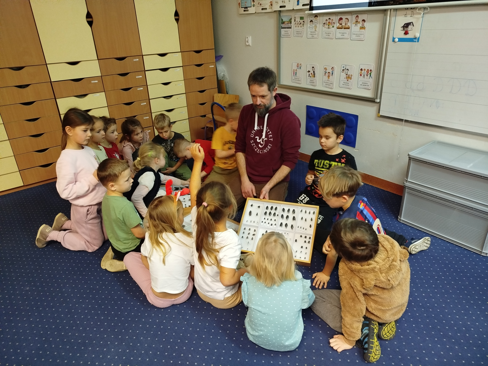 Podczas spotkania przedszkolaki dowiedziały się, że owady – podobnie jak ludzie – mają zmysły, dzięki którym orientują się w otoczeniu. Gość opowiadał o różnych gatunkach, m.in. o pchle, klecance, trzyszczu, pływaku, chrząszczu, szerszeniu czy straszyku. Dzieci z zainteresowaniem słuchały ciekawostek o życiu tych małych stworzeń.