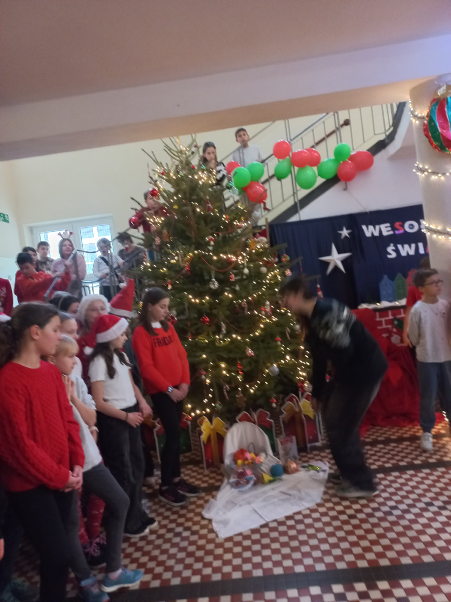 Przedstawiciele klas zawiesili na choince bombki i kartki z życzeniami. Pani Dyrektor życzyła wszystkim Wesołych Świąt, pełnych empatii dla drugiego człowieka.