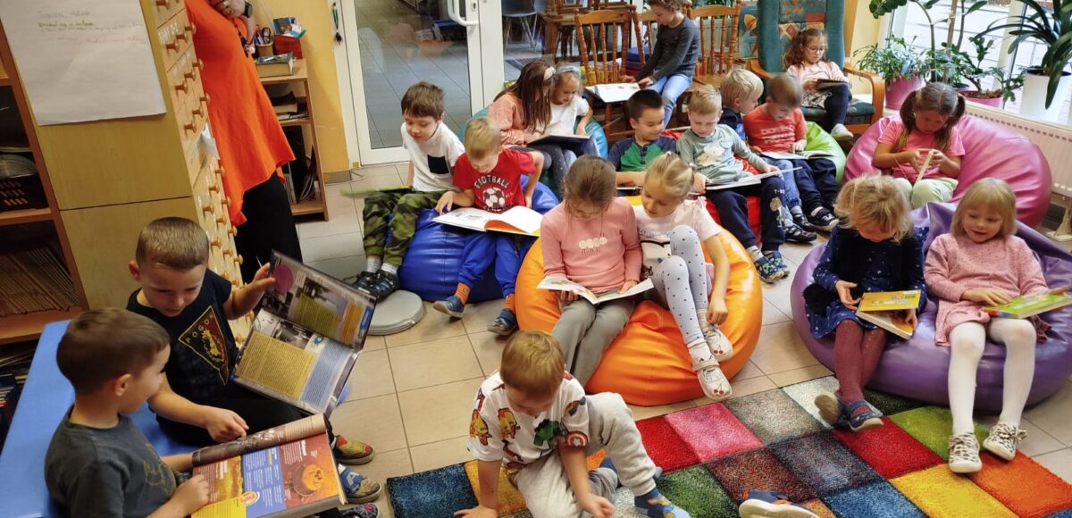 W ramach miesiąca poświęconego promowaniu czytelnictwa grupa przedszkolna „Mali Odkrywcy” wybrała się w niezwykłą podróż do krainy bajek i książek – naszej szkolnej biblioteki.